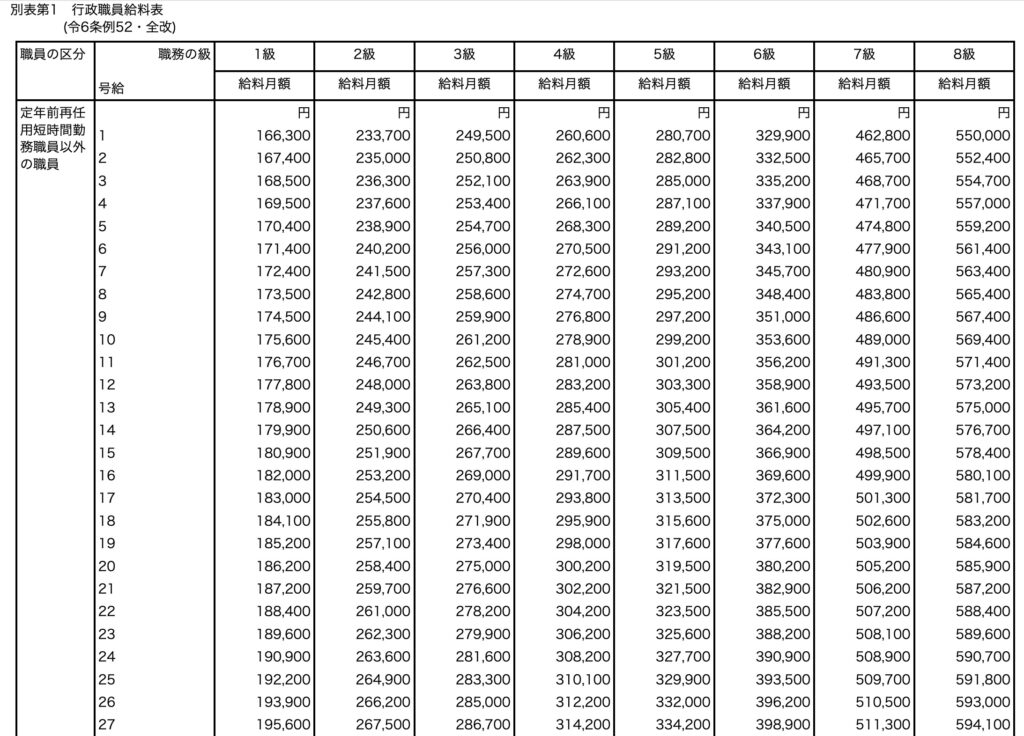 公務員の基本給は棒給表によって決まりますが、棒給表は自治体・職種ごとに異なります。