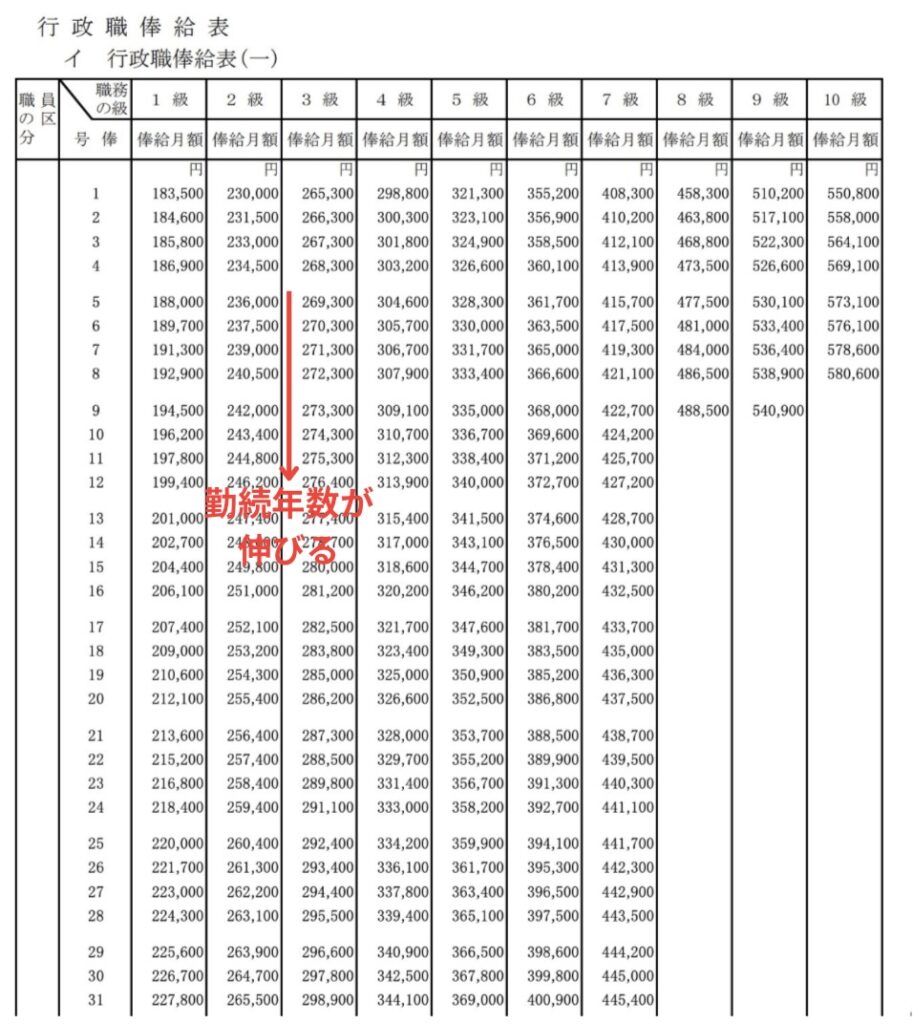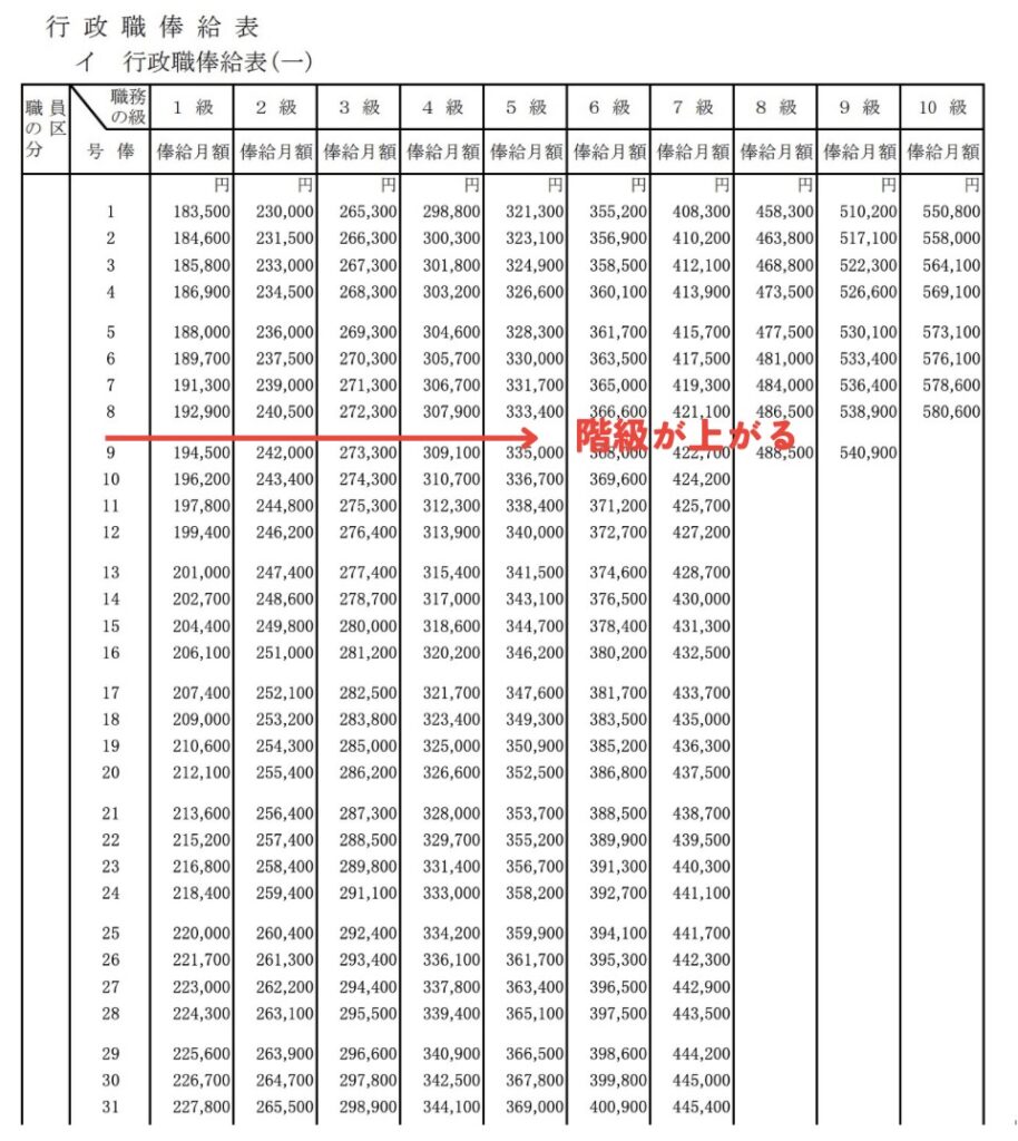 上記のように、勤続年数が延びると「号給」が下に行き、役職や階級が上がると「級」が右に移動します。