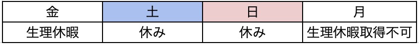例えば、金曜日に生理休暇を取得した場合、土日休みを挟んだ後の月曜日は「連続する2日間」とみなされず、取得不可能です。