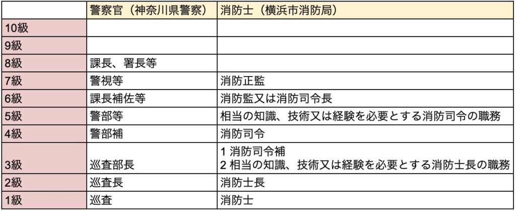 今回は、神奈川県警察と横浜市消防局を例にしましたが、行政職と同様に自治体によって級の分かれ方には差があります。