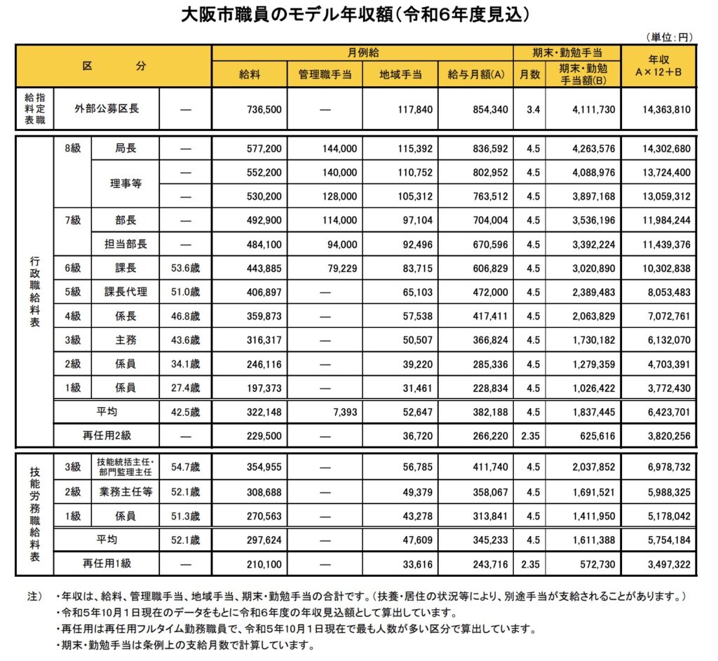 国家公務員か地方公務員、自治体によっても給料は異なりますが、今回は大阪市の役職別のモデル年収額をご覧ください。