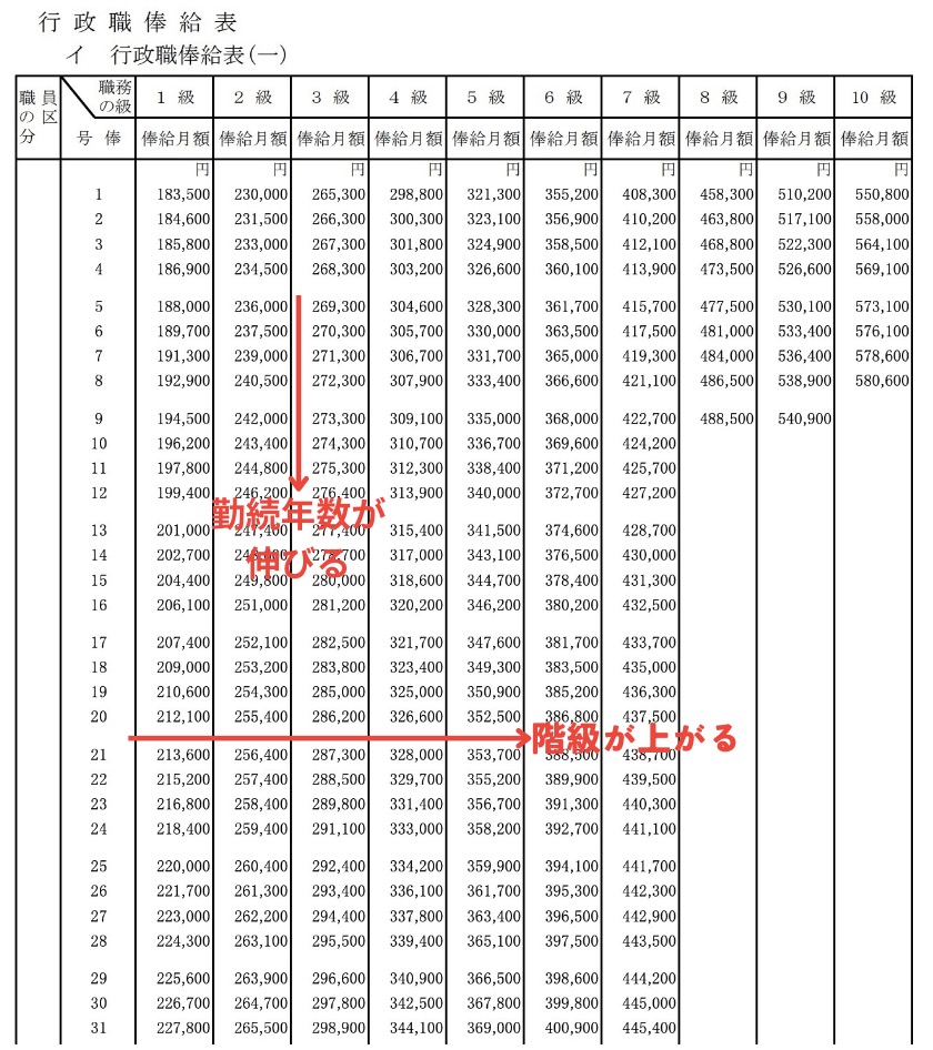 A 公務員の給料は棒給表によって定められており、階級と勤続年数等によって基本給が変わるからです。