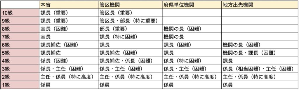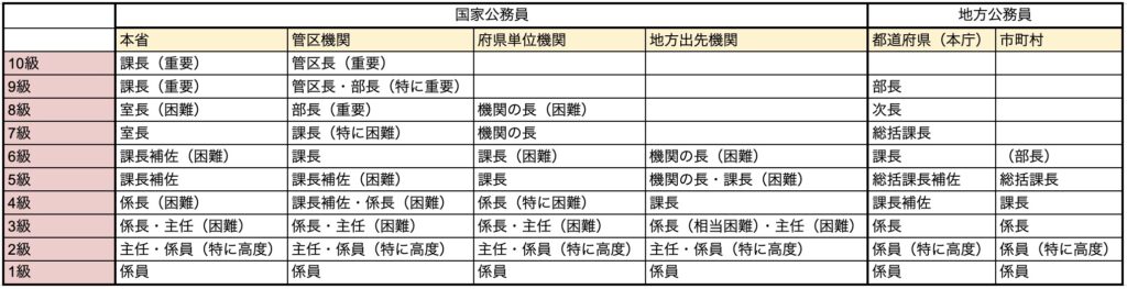 国家公務員の役職は10段階、地方公務員は自治体によって差がありますが大体9段階程度です。